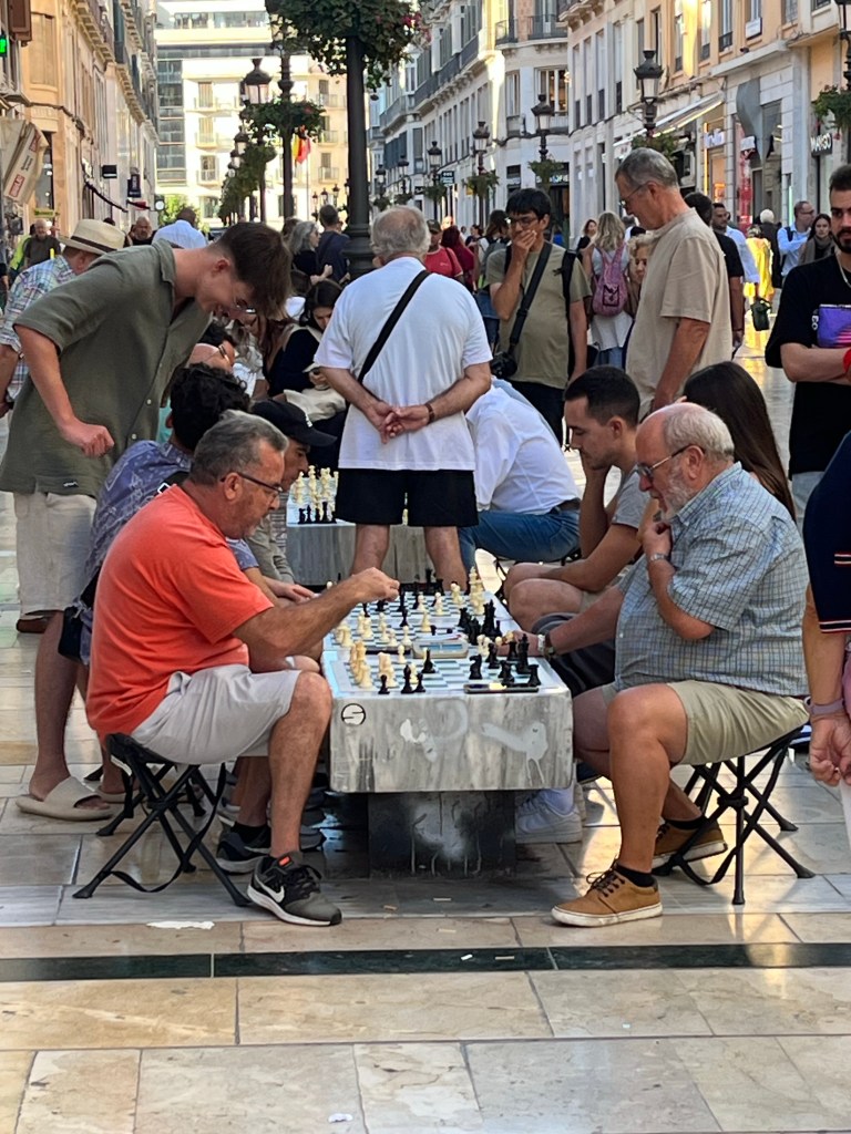I love the slightly overweight guys sitting on the tiny chairs playing chess. The fish looks great. Richie