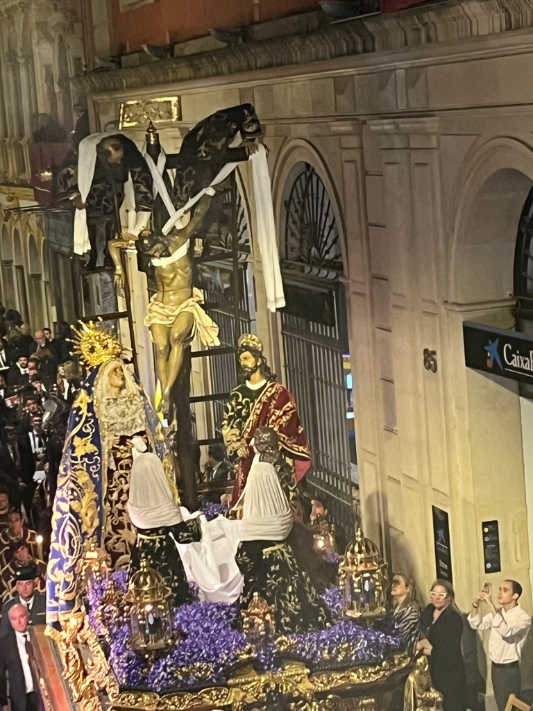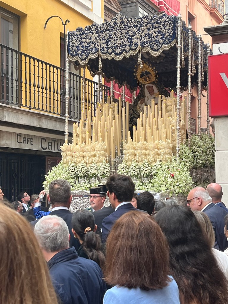 Each Hermanidad will have two Pasos: Paso del Palio (Mary) and Paso del Cristo (Christ or a scene with Christ). Each is carried by 30+ Costaleros under the Paso. The Paso is followed by a band whose music intensifies the experience. Last but not least are the Penetentes who carry wooden crosses. Below are some pictures and videos that don’t fully capture the beauty of the event.
