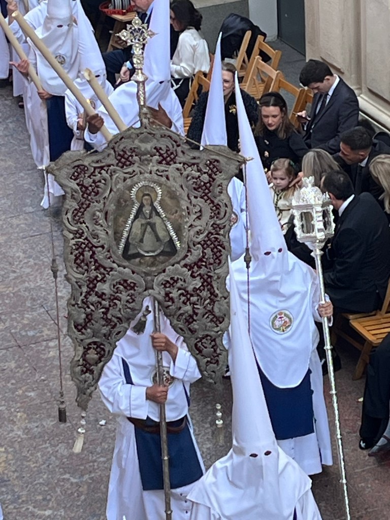 Then the banner for each Hermanidad is presented followed by hundreds of Nazarenos wearing the Capirotes
